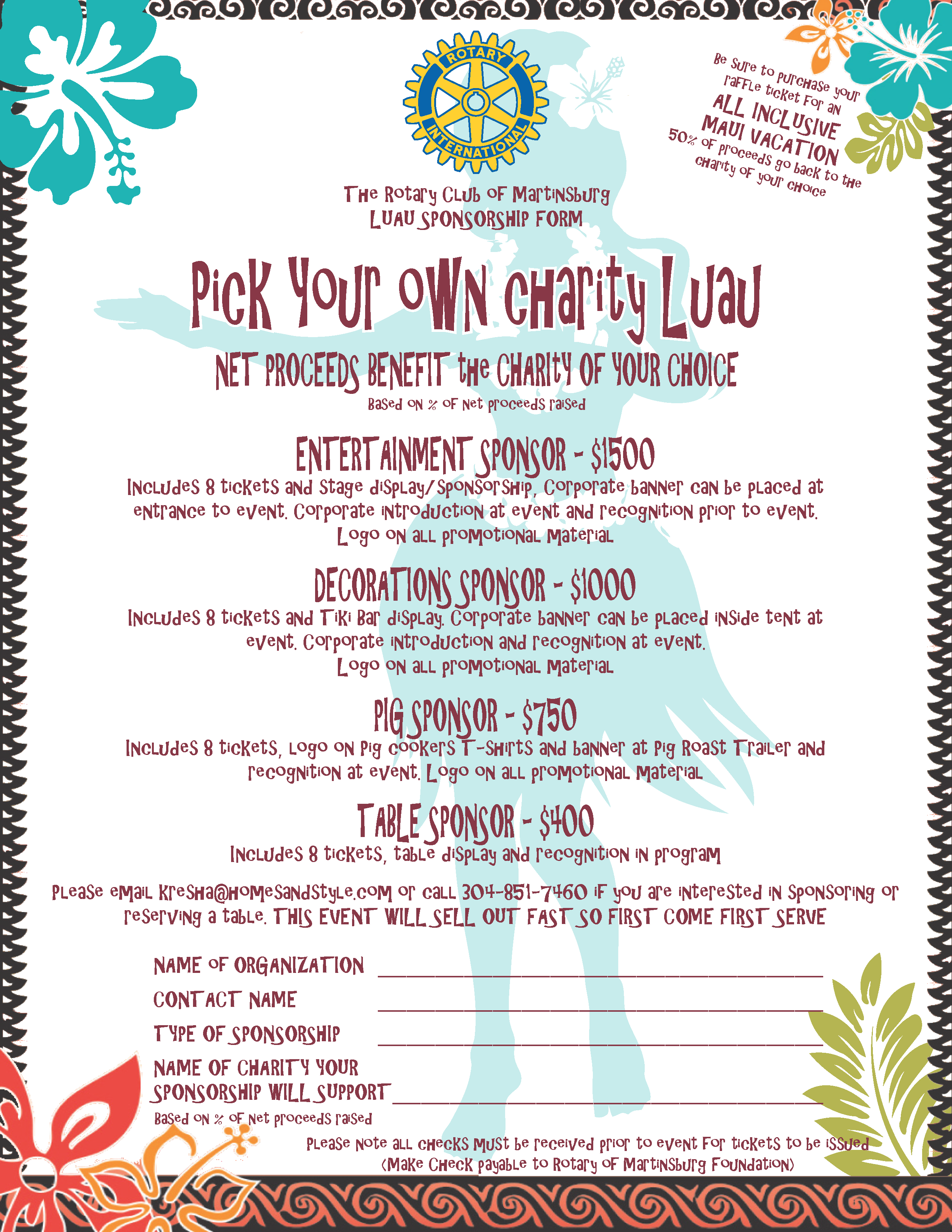 The Rotary Club of Martinsburg is sponsoring a “Hawaiian Luau” June 13, 2014 at the Purple Iris in Martinsburg. Festivities will start at 6 PM with an Authentic Lei Greeting and Welcome Tropical Cocktail followed by a pig roast and Hawaiian themed dinner at 6:30 PM. To cap off the evening, Polynesian dancers with an exciting fire-show will serve as entertainment. Additionally, there will be a limbo contest, a best-dressed award and a raffle for an all-inclusive trip for two to Maui.