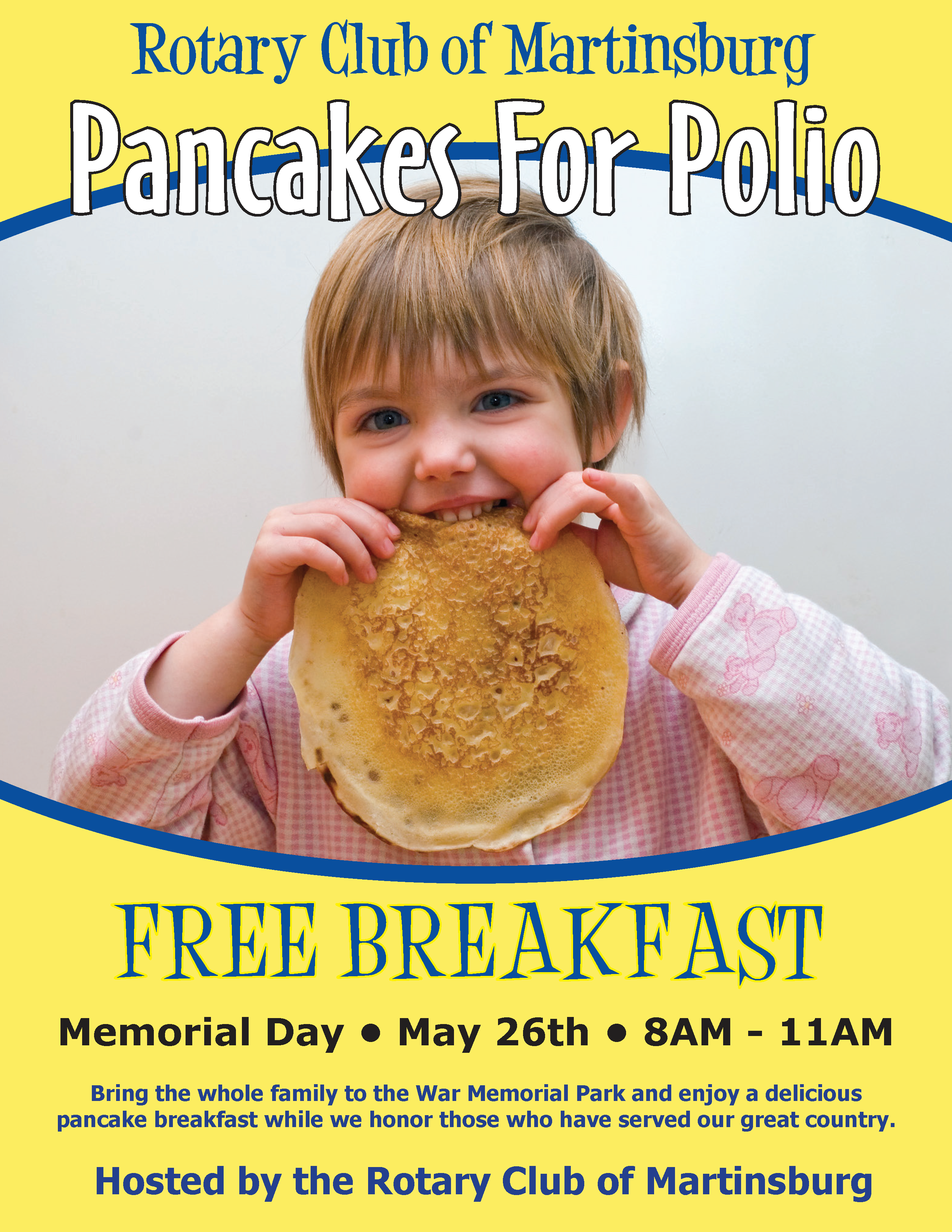 A pancake breakfast to raise funds for the eradication of polio will be held by the Martinsburg Rotary Club on Memorial Day. The pancake breakfast will be expanded this year to include sausage and gravy biscuits and will start at 8am and go through 11am.