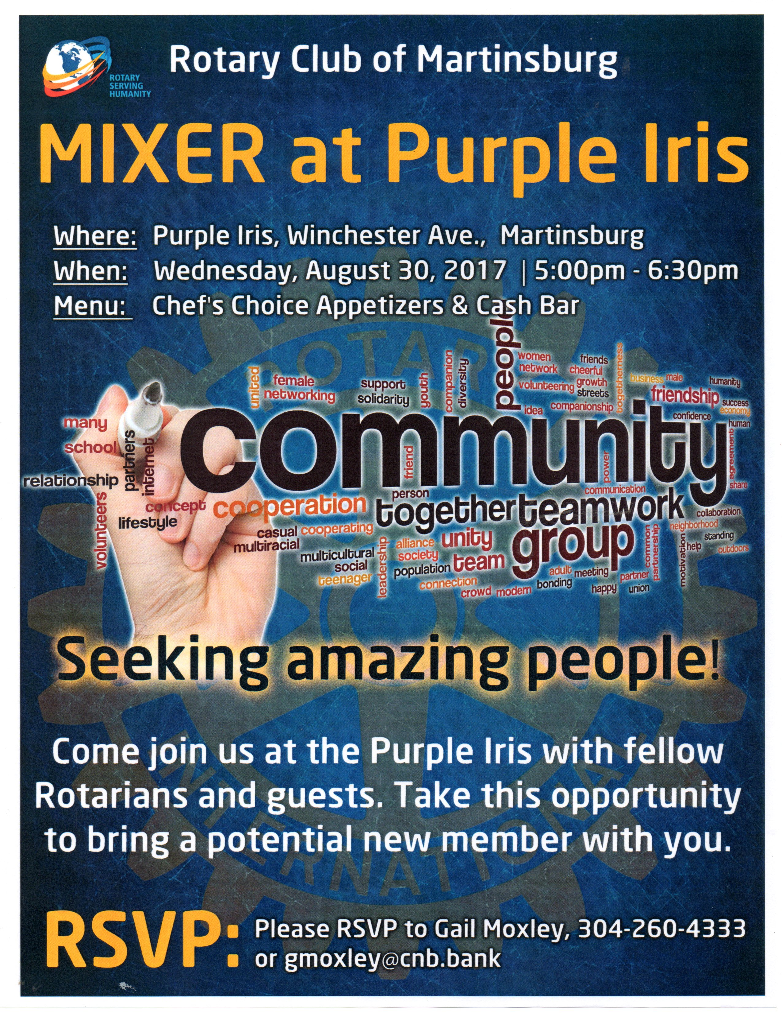 - LAST CALL FOR RSVPS – Rotary Mixer at the Purple Iris, August 30th (Wed), 5 to 630 pm. For your convenience, this mixer also is set up as a Facebook Event. Just click Rotary Mixer Event on Facebook for more details, to see some of those who are coming – and to RSVP. If NOT on Facebook, you may RSVP by email to > Gail Moxley or phone her at 304-260-4333