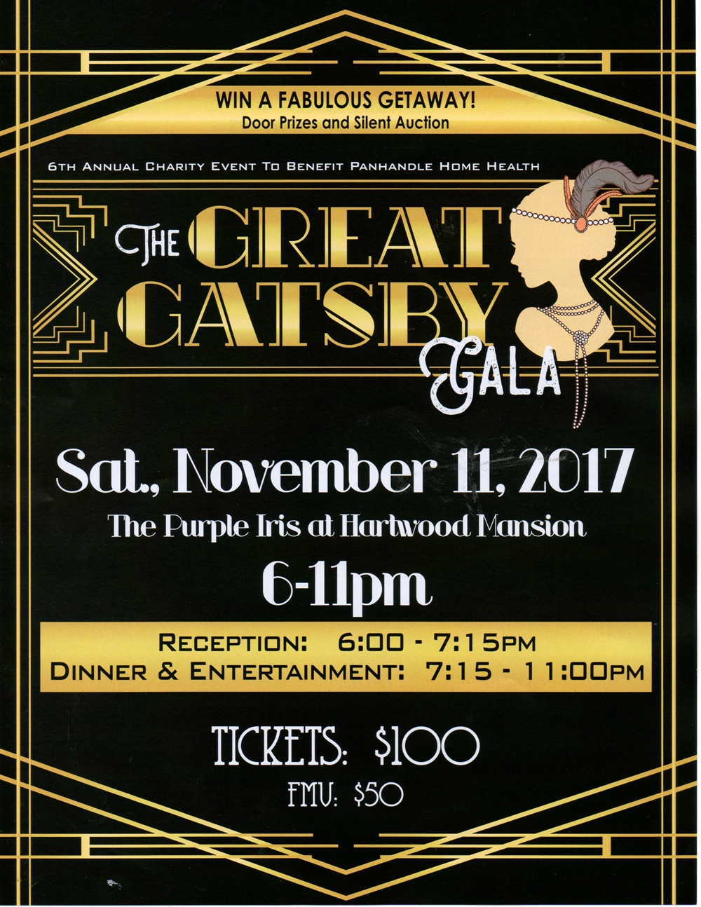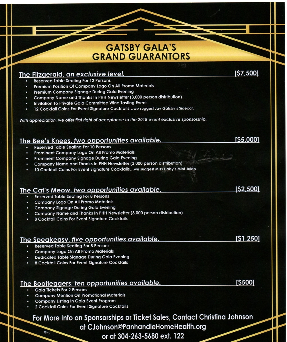 The Great Gatsby Gala, November 11 at the Purple Iris, Annual event to benefit Panhandle Home Health. Email Chris Johnson or call 304 263-5680, ext 122.